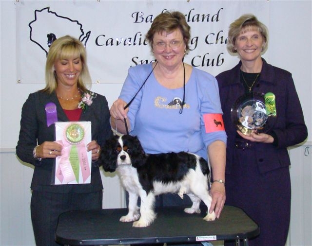 This DARLING little dog is Diego, who is owned by our friend Becky at Kingston Cavaliers. He is sired by our CH. Dillon and out of beautiful Libby, a CH. Sugar/CH. Nicky daughter. He is shown here winning his last points to complete his AKC champioship, under respected judge Ann Hearn. Diego is a special little dog, with a wonderful personality and the cutest head a cavalier has ever had.